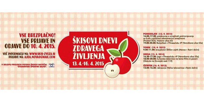 Ljubljana, 2. 4. 2015 – Škisovi dnevi zdravega življenja od 13. do 16. aprila na različne lokacije v Ljubljani prinašajo brezplačne športne aktivnosti in dogodke namenjene promociji in poučevanju o zdravem življenjskem slogu. V okviru projekta do 8. aprila poteka tudi nagradni fotografski natečaj na temo 'Študentski športni selfie'.
