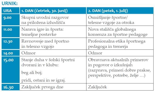 Udeležence želimo seznaniti z nekaterimi vsebinami športne prakse v šoli, ki zahtevajo etično tankočutnost pri razreševanju dilem. Gre za oblikovanje in utemeljevanje osebnega pristopanja k pouku ali treniranju s sodobnimi metodami. Izobraževanje je namenjeno športnim pedagogom in trenerjem otrok in mladine.