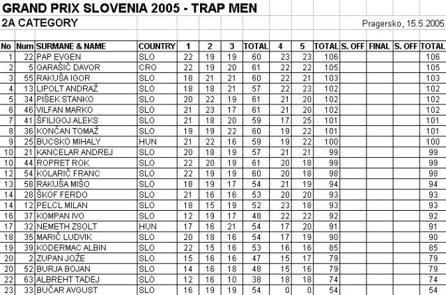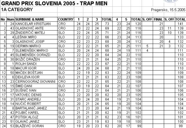 Zbralo se je toliko več slovenskih tekmovalcev, kar je pokazalo, da imamo precej solidnih tekmovalcev in med njimi nekaj prav odličnih, čeprav so končni rezultati pokazali, da so Hrvati Slovencem speljali kar nekaj odličij. Igor Lustin, kot selektor slovenske reprezentance je bil kljub vsemu zadovoljen z rezultati svojih tekmovalcev. Že včeraj smo si v Pragerskem lahko ogledali finale v ženski konkurenci in z odličji v trapu so odšle konkurentke v sledečem vrstnem redu – Maja Frangež, Polona