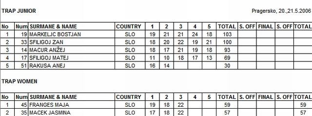 Med mladinci je bil v trapu najboljši Boštjan Markeljc (103) pred Žanom Šfiligijem (100) in Anžetom Macurjem (93), med ženskami pa Maja Frangež (59) pred Jasmino Maček (57).