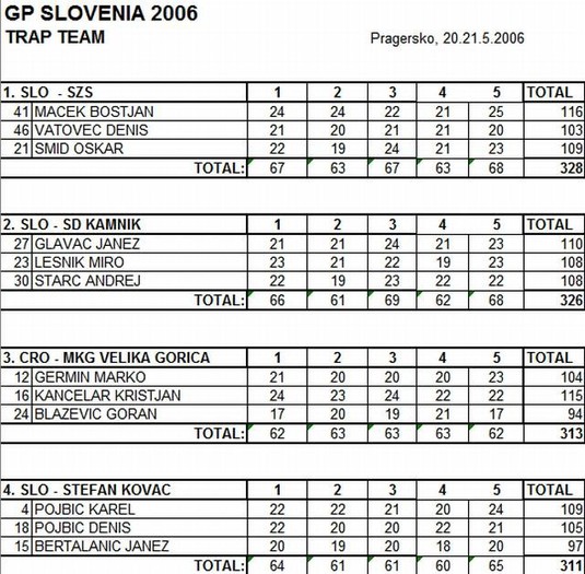 V ekipni konkurenci trap je zmagala A reprezentanca Slovenije v sestavi Boštjan Maček, Dani Šmid in Denis Vatovec s 328 zadetimi tarčami, pred ekipama SD Kamnik (Janez Glavač, Miro Lešnik in Andrej Starc) in ekipo iz Hrvaške.
