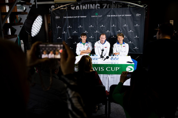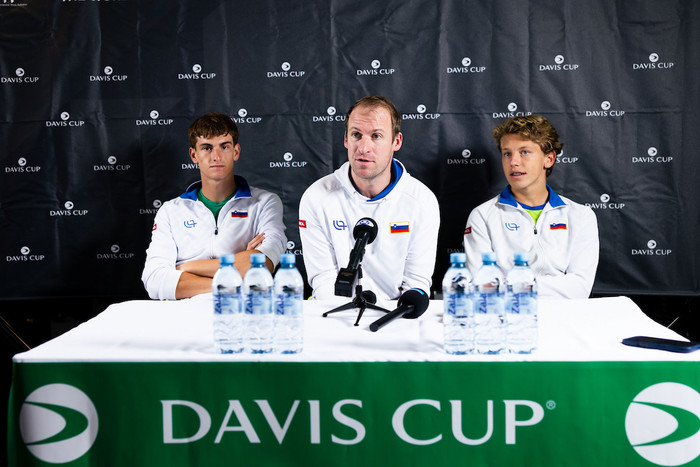 Na današnji novinarski konferenci je kapetan Grega Žemlja povedal: »Že nekaj dni smo v Velenju, včeraj se nam je priključil še Žiga. Nova tekma, nova rutina, nov izziv in nova pričakovanja. V tem tednu se je res veliko zgodilo – čestitke Žigi za zmago v Avstraliji –, danes je opravil šele prvi trening. Veliko moramo še premisliti in opraviti analizo. Verjamem, da smo sposobni zmagati; smo rahli favoriti. Vem, da bo težko, a upam na pozitiven rezultat. Mi smo izbrali podlago in žoge, ki nam ustrezajo. Zanimivo je, da njihova najboljša igralca lani sploh nista igrala na peščeni podlagi. Nekatere igralce poznamo, nekatere spremljamo skozi ta teden. Verjamem, da lahko sestavimo uspešno taktiko. Je pa veliko kombinacij, saj so tako naši kot tudi njihovi igralci zelo izenačeni; pri njih to velja za prve tri. Nekaj neznank še je, jutri po žrebu bo teh vprašanj že manj. Včasih je selektor ženske reprezentance Andrej Kraševec rekel, da so možnosti v odstotkih 51 : 49, tako da je nekaj takega tudi tokrat.«