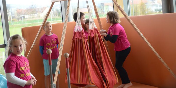 (Maribor, 19. november 2014) Dobrodelno združenje Koraki za korakce je s pomočjo sredstev, zbranih na majskem 7. dobrodelnem pohodu, opremilo že enajsto gibalnico. Tokrat so razveselili učence OŠ Miklavž na Dravskem polju. Šola je prostor, v katerem bodo otroci lahko razvijali svoje gibalne sposobnosti, opremila z bazenom z žogicami, sobnima in eliptičnim kolesom, s tekaško stezo, plezalom »Robin Hood«, stojalom z visečo mrežo, kompletom za bowling in številnimi drugimi pripomočki za razvijanje ravnotežja in senzorike. Nove pripomočke je danes otrokom in predstavnikom šole v imenu združenja uradno predala Andreja Kračun, predsednica Koraki za korakce.