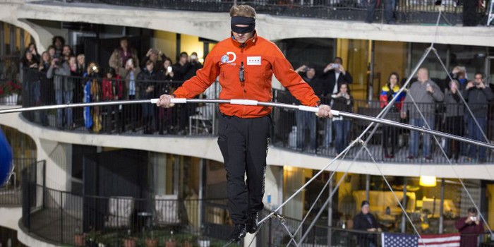 Nik se je prvič v zgodovini podviga lotil v dveh delih - v prvem delu je po jekleni žici prehodil navkreber, v drugem pa kar z zavezanimi očmi. Po uspešnem prvem delu podviga je Nik dejal: “To je bil najtežji del. Želim nadaljevati. Želim si stopiti na to žico. Želim si priti na drugo stran mesta.” V drugem delu pa si je Nik preko oči nadel še prevezo.