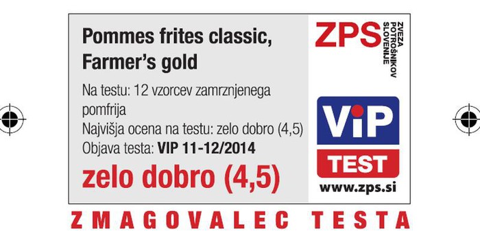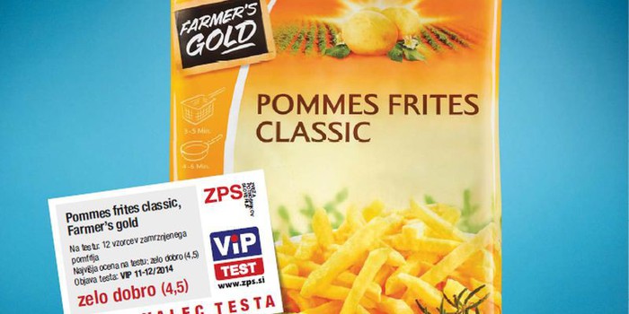 Na neodvisnem primerjalnem testiranju kakovosti, ki ga Zveza potrošnikov Slovenije in Mednarodni inštitut za potrošniške raziskave redno izvajata skupaj z neodvisnimi ustanovami v Sloveniji in drugimi državami EU, je na tokratnem testiranju 12 vzorcev zamrznjenega predpečenega krompirčka izdelek Farmer΄s Gold, Pommes frites classic kot edini prejel nadpovprečno oceno »zelo dobro« (4,5) in postal zmagovalec testa. Na lestvici se mu je pridružil v sončničnem olju predpečeni krompirček iste blagovne znamke z oceno dobro (4,2).