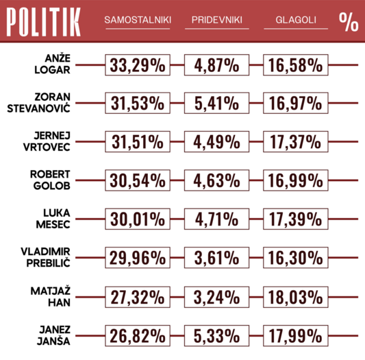 Jezikovna struktura razprave razkriva tri specifične komunikacijske sloge, ki se med seboj jasno razlikujejo glede na slog govorcev. Medtem ko Anže Logar s (33,29 %) odstotnim deležem samostalnikov stavi na izrazito nominalen slog, ki poudarja visoko stopnjo konceptualizacije in fokus na konkretne projekte, se Zoran Stevanović (5,41 %) in Janez Janša (5,33 %) poslužujeta vrednostnega sloga z visoko rabo pridevnikov za močno opisno vrednotenje in neposredno kritiko. To dinamiko dodatno dopolnjujeta Matjaž Han (18,03 %) in ponovno Janez Janša (17,99 %), ki s poudarjeno rabo glagolov v diskurz vnašata akcijsko komponento, osredotočeno na izvajanje dejanj in procesov.