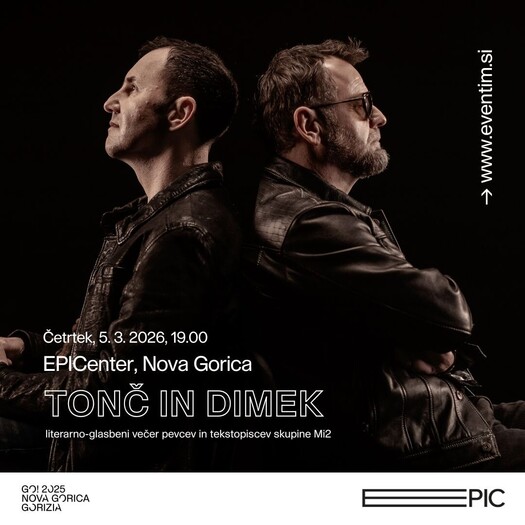 V novi dvorani EPICentra, se bo v četrtek ob 19. uri odvil zanimiv glasbeni večer, na katerem bosta nastopila Tonč in Dimek, pevca in tekstopisca skupine Mi2. V prostoru, imenovanem evropska platforma za interpretacijo 20. stoletja, ki hkrati ponuja razmislek o prihodnosti, bosta izvedla literarno-glasbeni večer. Ob spremljavi akustične kitare podata svoje skladbe v povsem prvinski obliki – takšni, v kateri so skladbe dejansko nastale, preden so jih v rockersko preobleko stlačili člani zasedbe