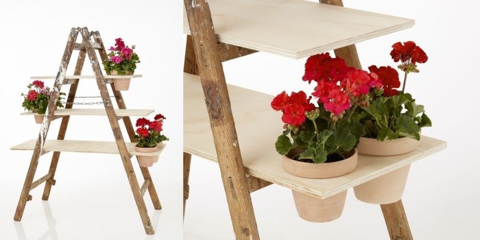 Ta zunanji regal za mestni balkon, ki ga lahko naredite sami, ni le lep, ampak tudi praktičen, saj ponuja ogromno prostora, poleg tega pa ga lahko uporabite kot pregradno ali špansko steno. Njegova ključna prednost je ta, da so cvetlični lonci, v katerih so nasajene pelargonije, vgrajeni v police, zato se ne morejo prevrniti. Da poustvarite ta trendovski regal, potrebujete lestev, tri do štiri 16 milimetrov debele deske, akumulatorski vrtalnik, vijake in izvijač, vbodno žago, brusilni papir,