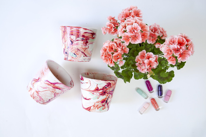 Navodila: Najprej lak za nohte izbranih barv nakapajte v posodo, napolnjeno z vodo. Nato previdno pomešajte z leseno paličico, da nastane zanimiv vzorec. Na koncu hitro potopite cel lonec v vodo, tako da je mokra celotna zunanja površina. Odlijte vodo iz lonca in pustite, da se posuši. Vaša edinstvena umetnina je končana. Nasvet: Ker niti dva lonca nista enaka, več tovrstnih loncev, ki stojijo eden ob drugem, ustvari odlično popestritev.