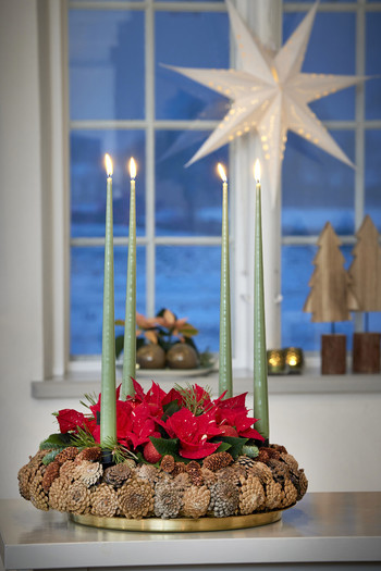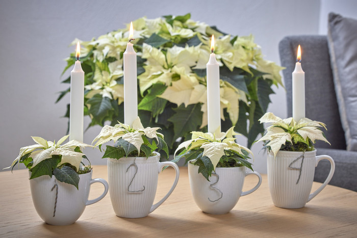Adventna dekoracija z božičnimi zvezdami in skodelicami ali skodelami je sodobna alternativa klasičnemu adventnemu vencu. Ta predelani aranžma na levi izstopa s svojo preprostostjo. Štiri bele skodelice so okrašene s številkami iz žice in opremljene s svečami, ki so zasajene med mini božične zvezde v kremni barvi, ter razporejene v vrsti na okenski polici ali mizi. Nasvet: Malo gline na dnu skodelic bo držalo sveče na mestu. S kleščami oblikujte številke iz debele žice in jih pritrdite z