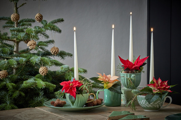 Za praznični dizajn na desni prav tako ne potrebujete veliko časa, le mini božične zvezde, sveče, skodelice in skodele. Kontrast med rdečimi listi božičnih zvezd in zeleno posodo, pa tudi različnimi slogi skodelic, ustvarja popolnoma drugačen videz od aranžmaja z belimi skodelicami. Doma narejeno adventno dekoracijo postavite na svetel in topel prostor stran od prepiha. Mini božične zvezde redno zalivajte od zgoraj v majhnih odmerkih, da se prepričate, da ne zamočijo.