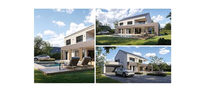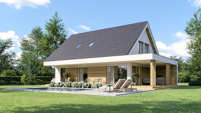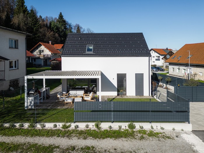 Voden ogled hiše Lumar Kaja-M 111 – sodoben in individualno prilagojen pristop k trajnostni gradnji v praksi.