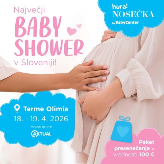 19. 2. 2026 - Pomlad prinaša nekaj prav posebnega za bodoče starše. Baby Center organizira dvodnevni dogodek Hura! NOSEČKA, največji BABY SHOWER v Sloveniji, ki bo potekal 18. in 19. aprila v Termah Olimia v Podčetrtku. Ne gre za še eno klasično šolo za starše, temveč za vikend doživetje, kjer se bodo prepletali znanje, sprostitev in zabava. Namenjen je nosečnicam, njihovim partnerjem ali prijateljicam, ki si želijo trenutek zase, kakovostne informacije in občutek, da v novo življenjsko poglavje vstopajo samozavestno in pripravljeno.