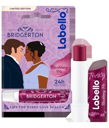 Balzam Labello Bridgerton Blackberry Pie, ki pripoveduje zgodbo Kate in Anthonyja, ustnice razvaja z zapeljivo aromo robid in nežnim bordo odtenkom.