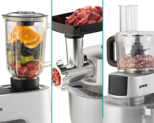 opravilom. Tako dosežete enakomerne rezultate in prihranite čas pri ročnem delu. Z različnimi nastavki in dodatki se enostavno prilagodijo številnim kuhinjskim opravilom ter podprejo tako vsakodnevno kuhanje kot tudi bolj ustvarjalne recepte. Predstavljamo štiri modele kuhinjskih robotov Gorenje, ki segajo od osnovnih do naprednejših zmogljivosti.