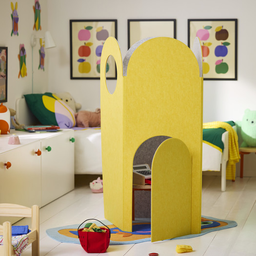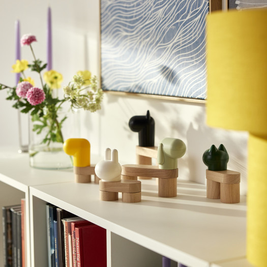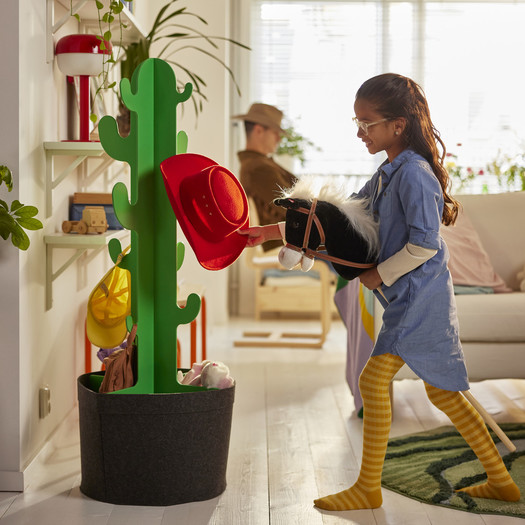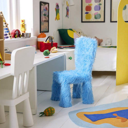 MAMMUT otroški stol, klasika podjetja IKEA, ki navdušuje že 30 let, je dobil svežo podobo s kosmato prevleko v živahno rožnati ali modri barvi. Enote za shranjevanje v obliki mačk in zvočniki v obliki mišk – v vijolični ali zeleni – so hkrati funkcionalni in estetsko igrivi. Klasičen shranjevalni taburet šele ob odprtju razkrije svojo notranjo “pošast”, ki z zobatim nasmehom “požre” vse, kar shranjujete v njej, medtem ko je gugalni konjiček, preoblikovan v ptico, hkrati skulptura in igrača.