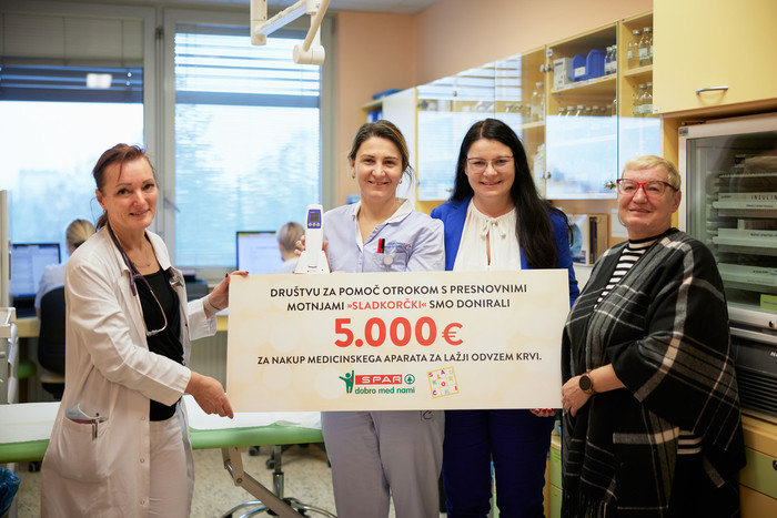 Ljubljana, 1. marec 2023 - Društvu za pomoč otrokom s presnovnimi motnjami, ki deluje v okviru Pediatrične kliniki v Ljubljani, je Spar Slovenija podaril 5.000 evrov. Z donacijo, ki je potekala pod okriljem Sparove akcije Super Foodies, so Društvo podprli pri načrtovanem nakupu medicinskega aparata za lažji odvzem krvi pri najmlajših otrocih.