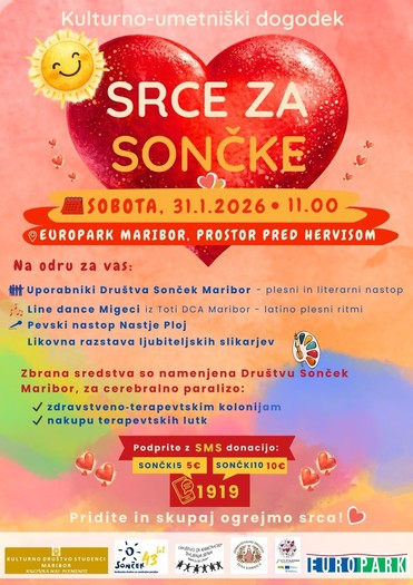 27. 1. 2026 - Spoštovani in spoštovane, vljudno vas vabimo, da postanete del humanitarnega projekta »SRCE ZA SONČKE«, ki bo potekal v soboto, 31. januarja 2026, ob 11.00 uri v Europarku Maribor, pred trgovino Hervis. Projekt povezuje umetnost, solidarnost in medgeneracijsko povezovanje. Skozi ples, glasbo in likovno ustvarjanje se bodo predstavili uporabniki društev, medgeneracijska plesna skupina Migeci ter pevka Nastja Ploj.