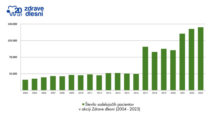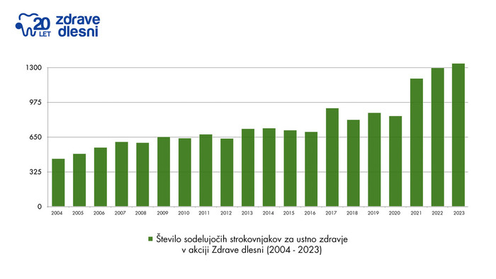 (Ljubljana, 5. oktober 2023) - 15. oktober letos že 20. leto naznanja pričetek akcije Zdrave dlesni, katere poslanstvo je ozaveščanje, prepoznavanje in preprečevanje parodontalne bolezni. Gre za eno najbolj razširjenih kroničnih bolezni, s katero se srečuje več kot 90 odstotkov Slovencev. Ker so vnete dlesni, karies in zadah večinoma posledice pomanjkljive ustne higiene, je ključna preventiva. Zato je izredno dragocena podpora številnih strokovnjakov za ustno zdravje. V povprečju se jih k sodelovanju letno prijavi več kot 1200. To pomeni, da je pouka o preventivi z informacijami o popolni ustni higieni deležnih več kot 65.000 posameznikov.